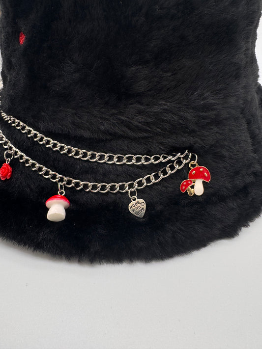 B&W Cow - Bucket Hat - Red with Gold Flower Pins and Chains