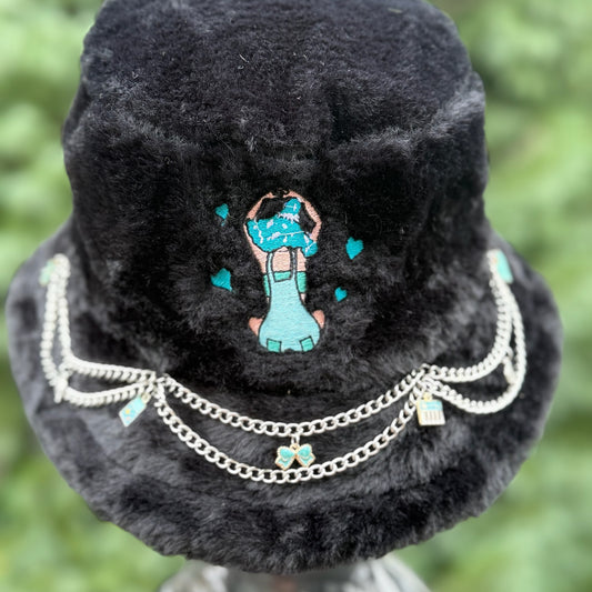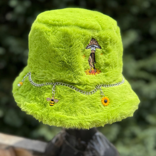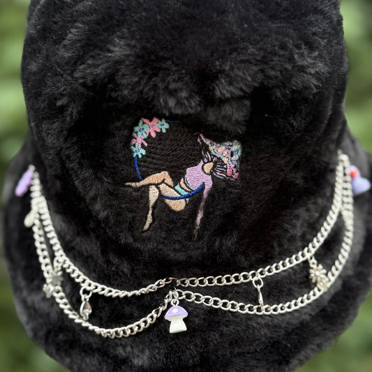 Indulge in whimsical elegance with our charming Bucket Hats! Experience the fluffiest bucket hat adorned with a delightful mushroom girl embroidery. Enhanced with hand-sewn chains and uniquely curated charms, each hat radiates its own one-of-a-kind personality.