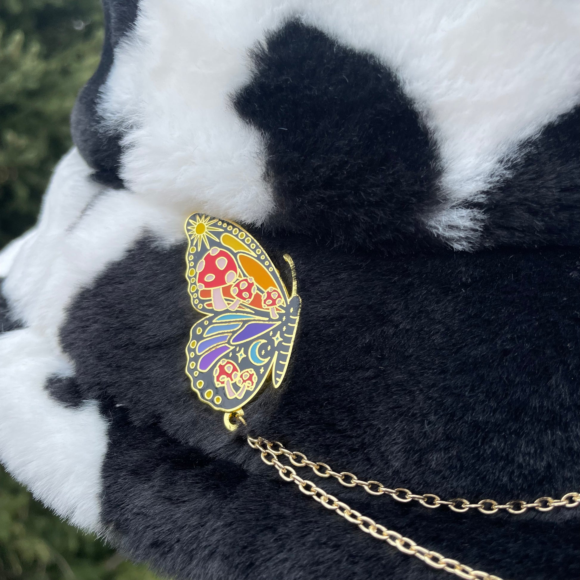 Add a playful touch to your outfit with our Black & White Cow Print Plush Bucket Hat, featuring our 3 piece pin set with connecting chains. The pins have locking backs, so they are removable when you want them to be.
