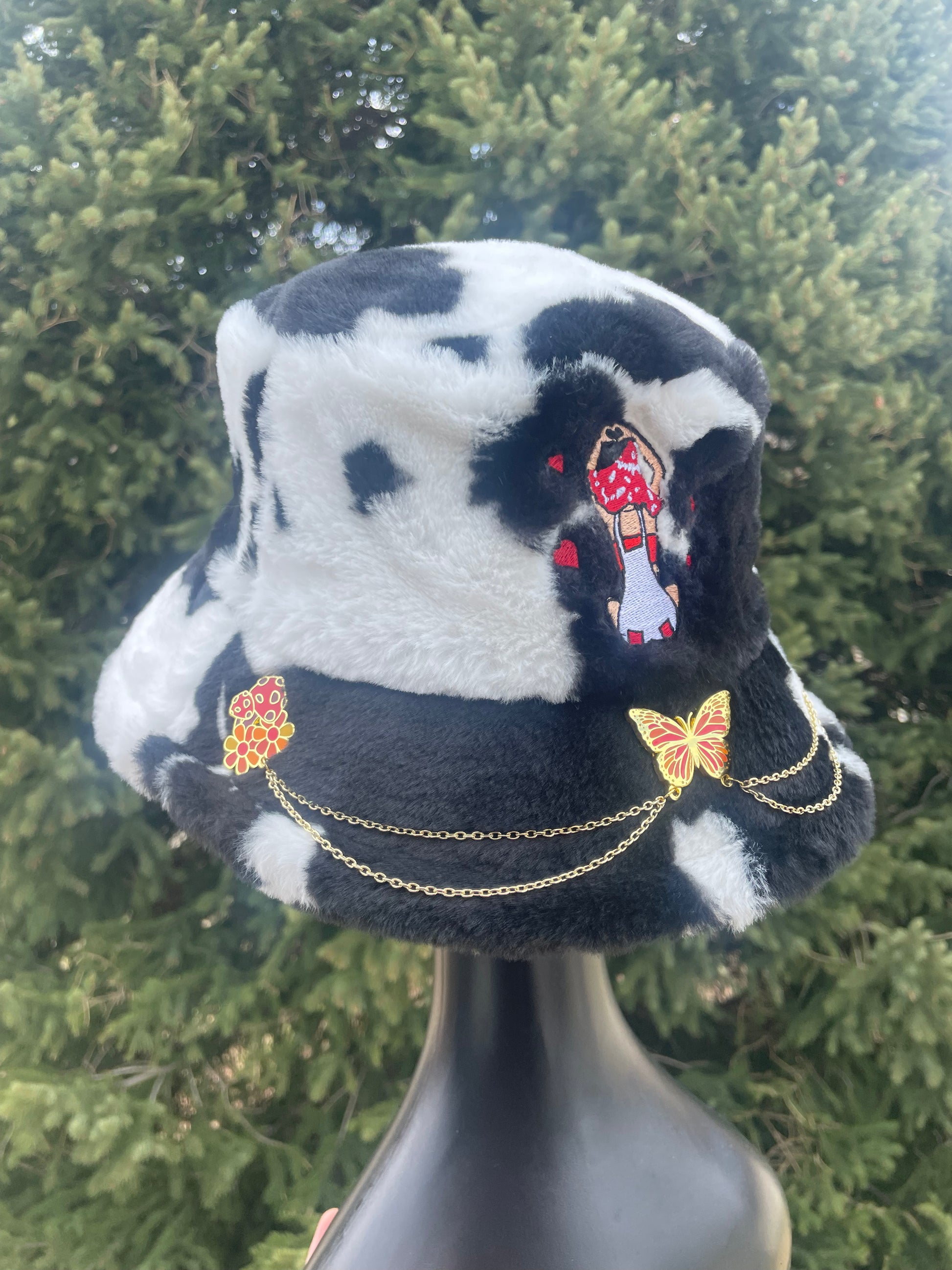 Add a playful touch to your outfit with our Black & White Cow Print Plush Bucket Hat, featuring our 3 piece pin set with connecting chains. The pins have locking backs, so they are removable when you want them to be.
