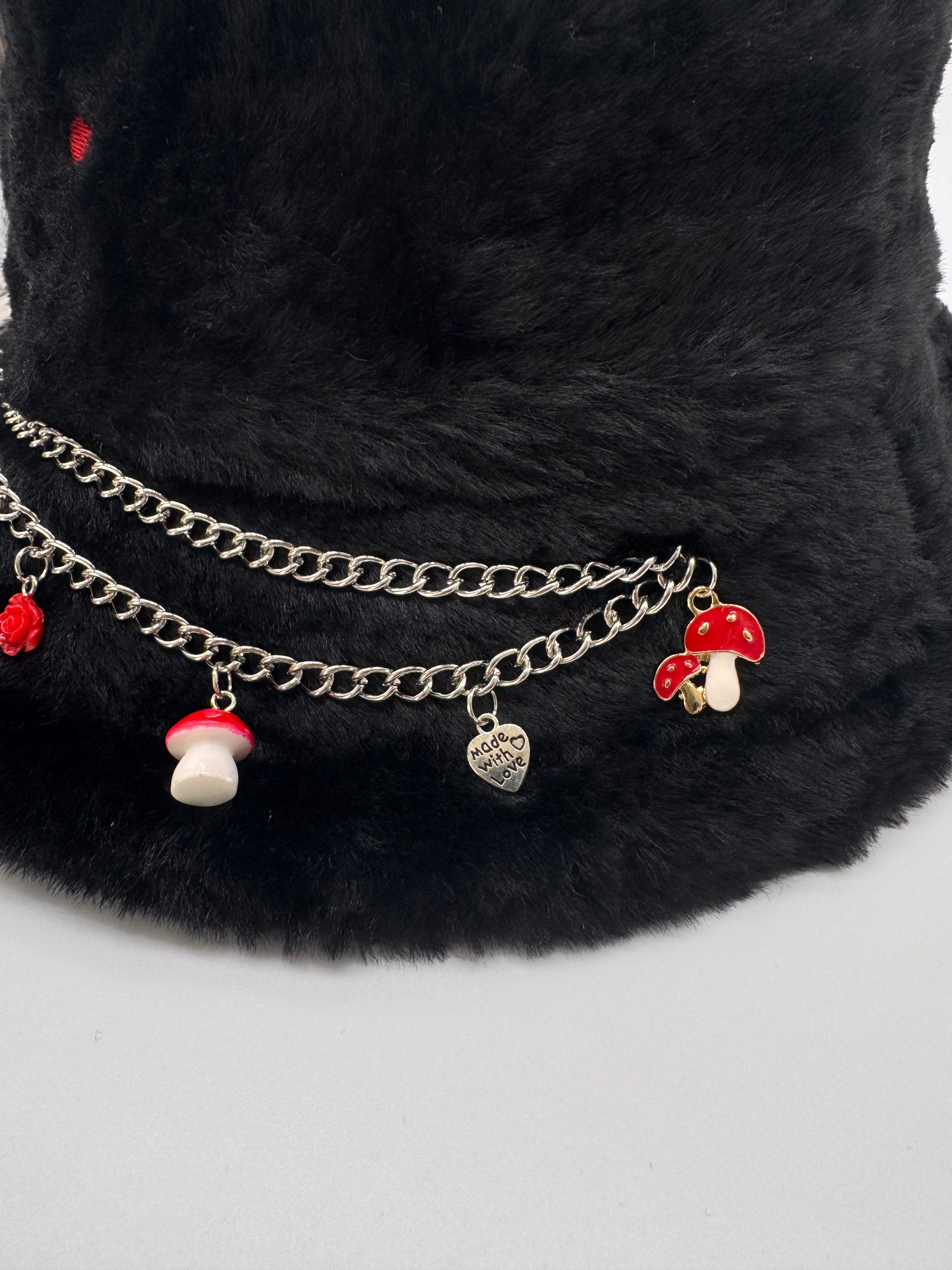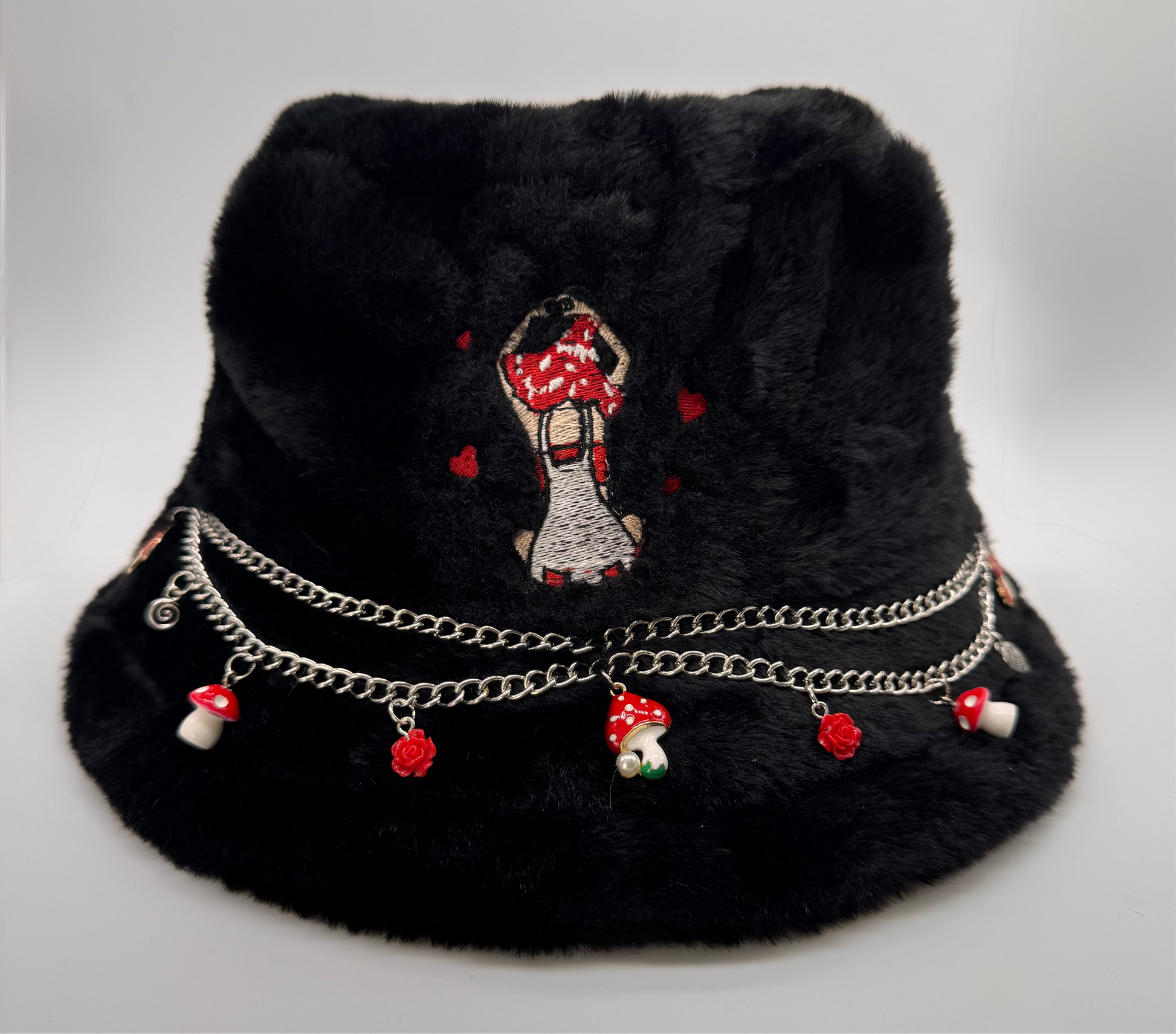 Our Black Heart MILF Bucket Hat is adorned with hand-sewn chains and thoughtfully curated charms, each hat has a distinct personality. At its core is the embroidered centerpiece: a charming red mushroom girl, expressing boundless love in every stitch. Embrace whimsy and elegance with every wear as you indulge in this delightful accessory.