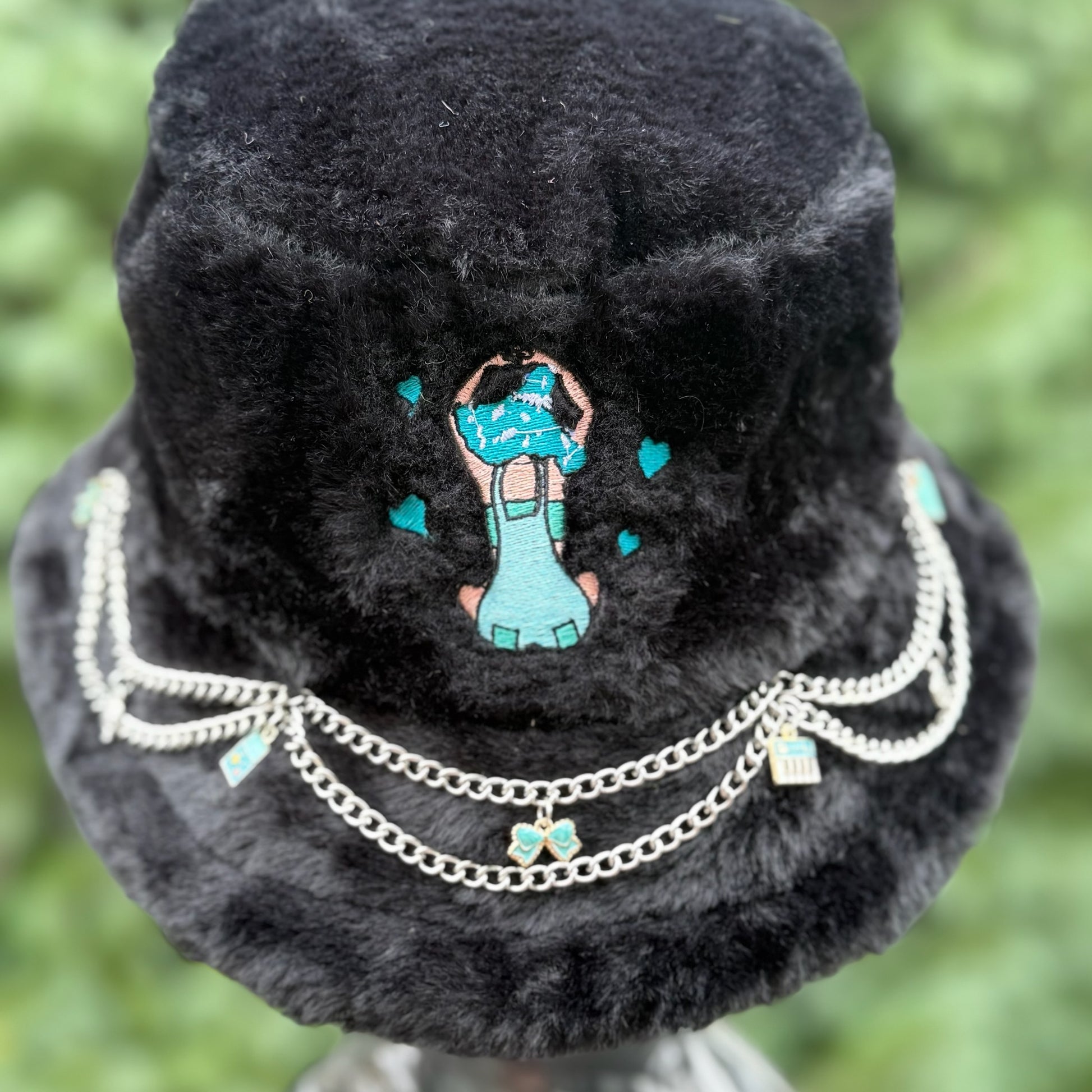 Our Black Heart Bucket Hat is adorned with hand-sewn chains and thoughtfully curated charms, each hat has a distinct personality. At its core is the embroidered centerpiece: a charming mushroom girl expressing boundless love in every stitch. Embrace whimsy and elegance with every wear as you indulge in this delightful accessory.
