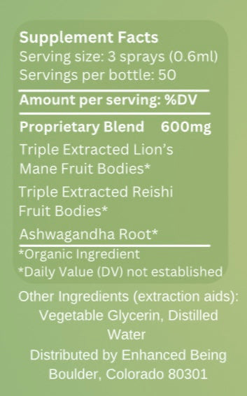 Unlock your mind's potential with Enhanced Being’s Flow State Spray! Elevate your focus, boost vitality, and conquer the day with the transformative blend of Lion’s Mane Mushroom, Reishi Mushroom, and Ashwagandha. Your journey to clarity begins here!