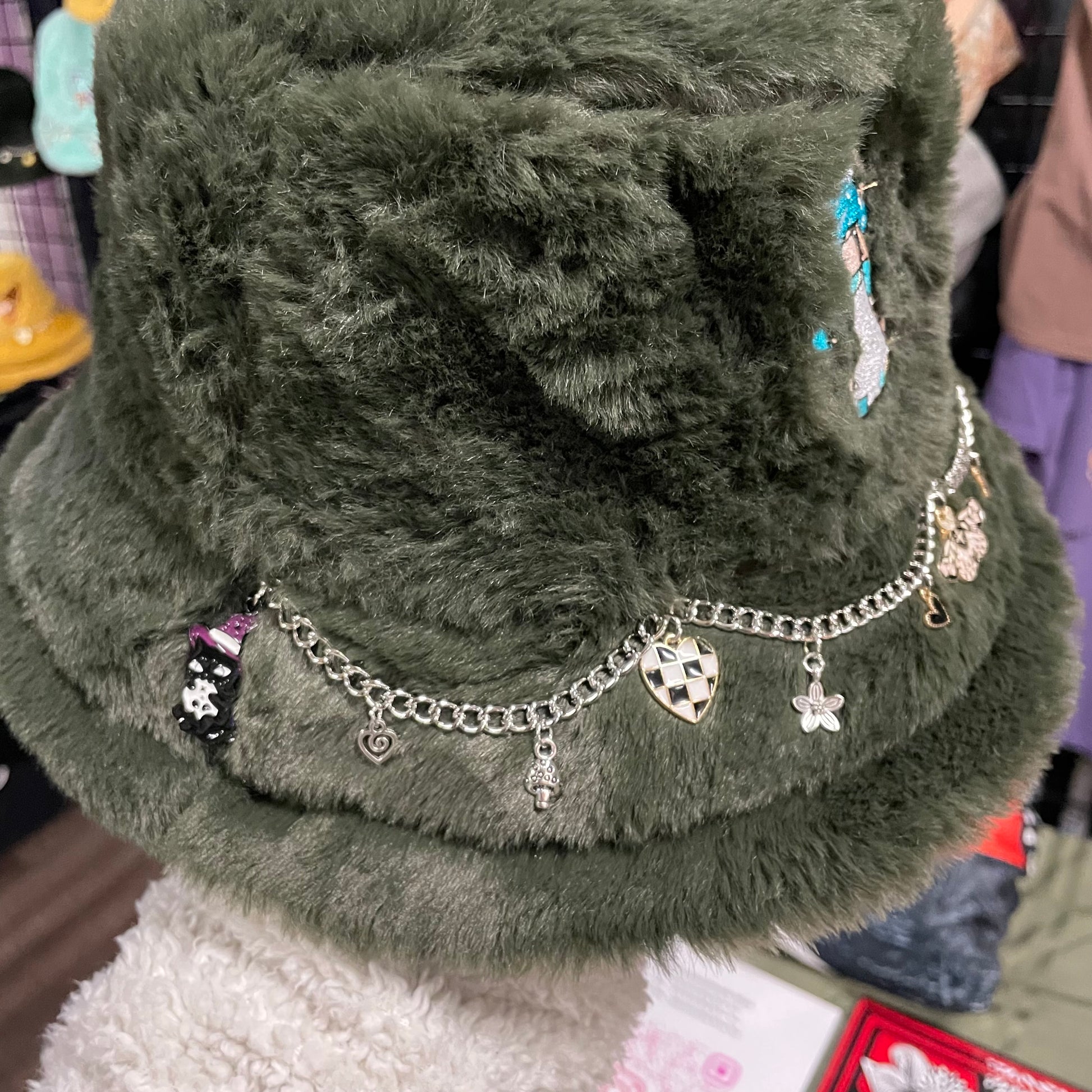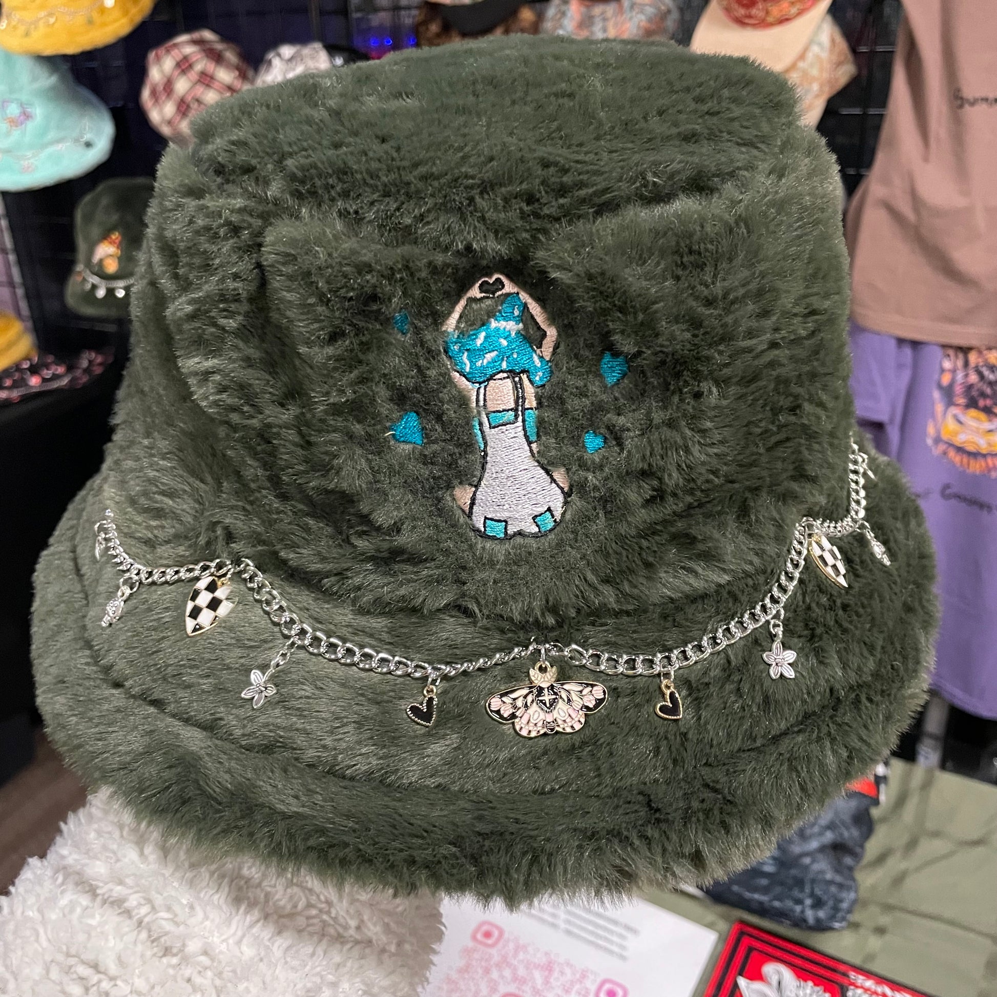 Discover our Green bucket hats, blending style and whimsy. Adorned with hand-sewn chains and unique charms, each hat features an embroidered mushroom girl, adding playful elegance to your look.