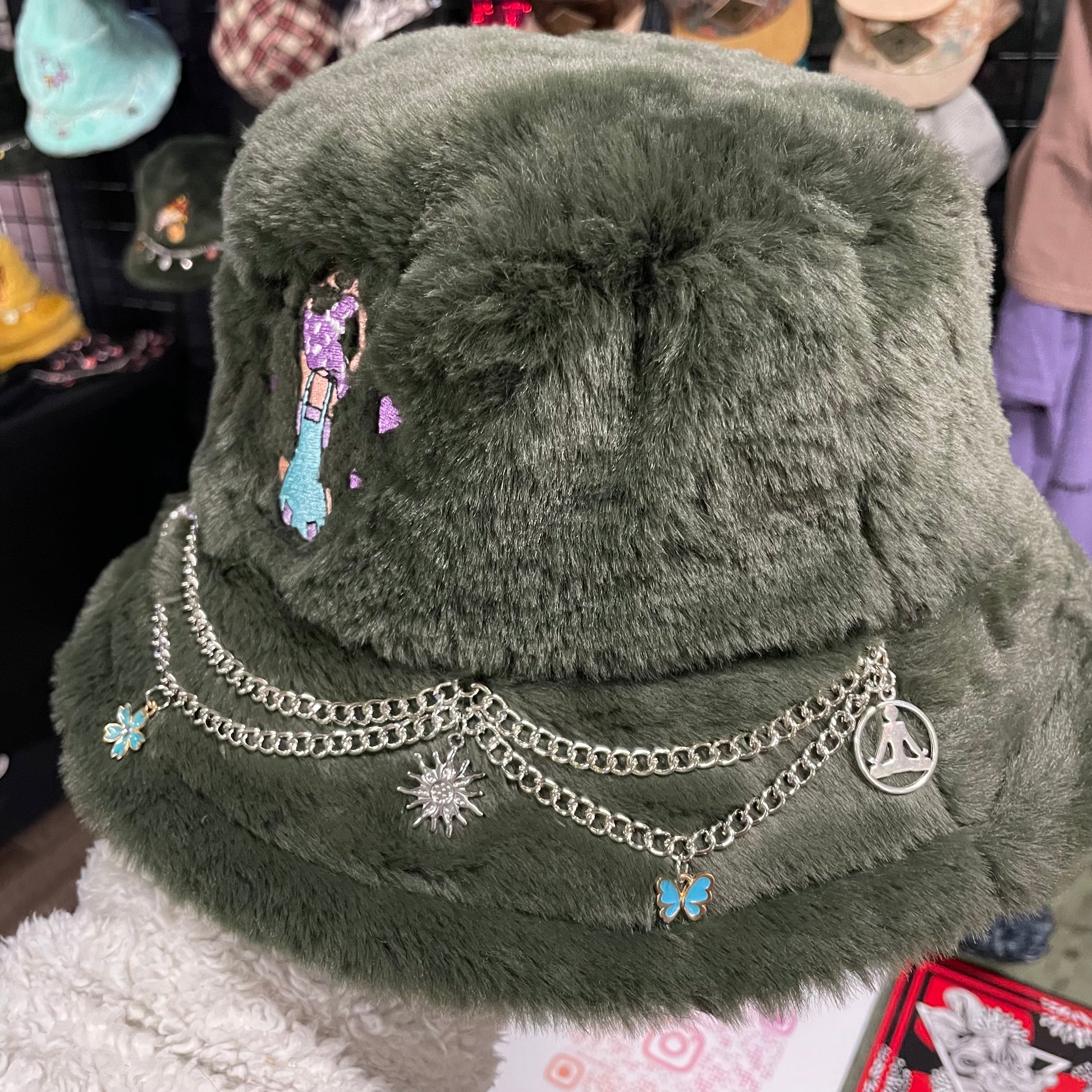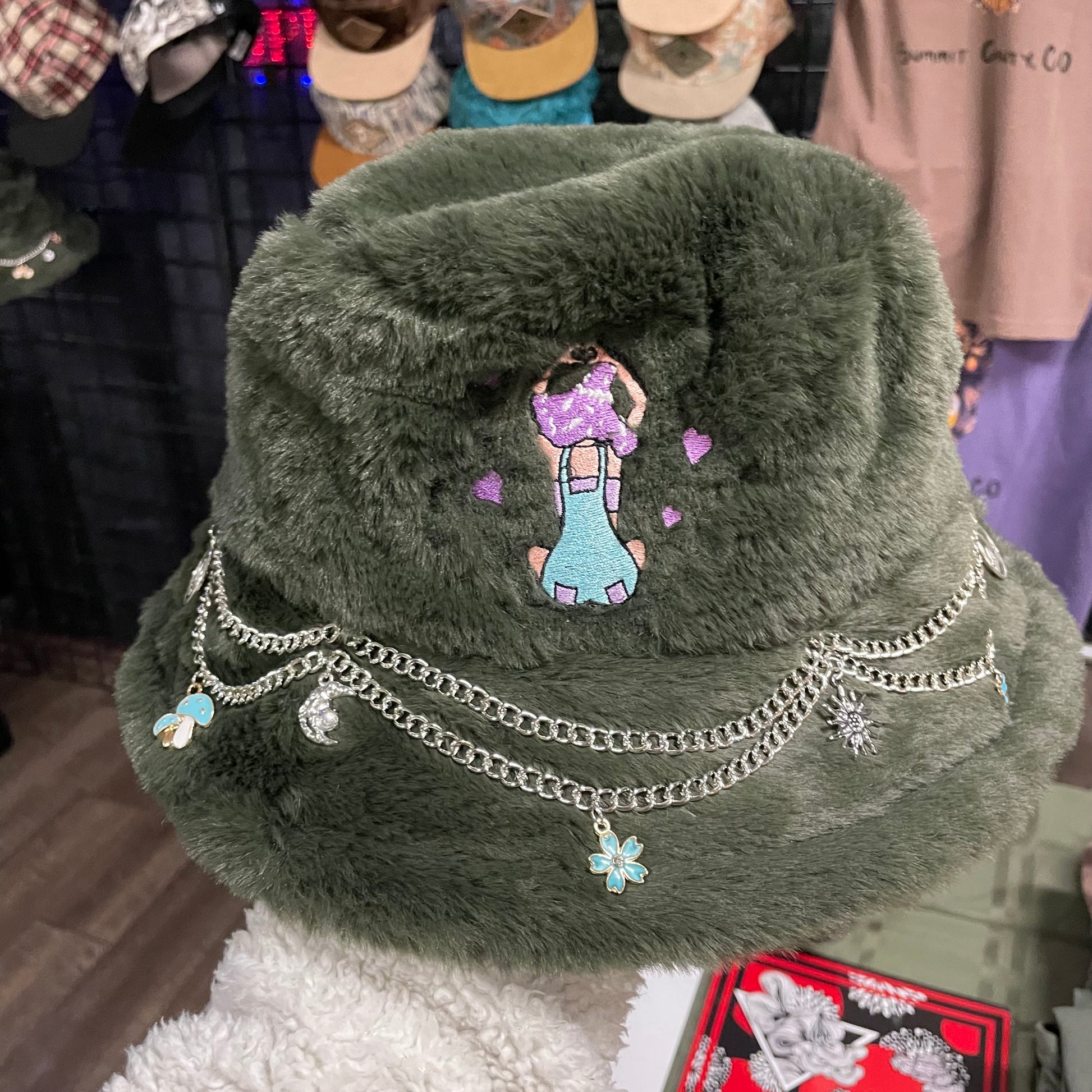 Discover our Green bucket hats, blending style and whimsy. Adorned with hand-sewn chains and unique charms, each hat features an embroidered mushroom girl, adding playful elegance to your look.