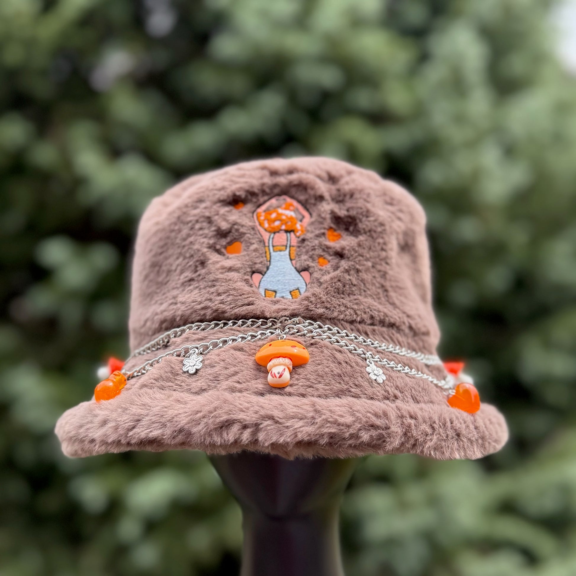 Our Grey Heart Bucket Hat is adorned with hand-sewn chains and thoughtfully curated charms, each hat has a distinct personality. At its core is the embroidered centerpiece: a charming mushroom girl expressing boundless love in every stitch. Embrace whimsy and elegance with every wear as you indulge in this delightful accessory.