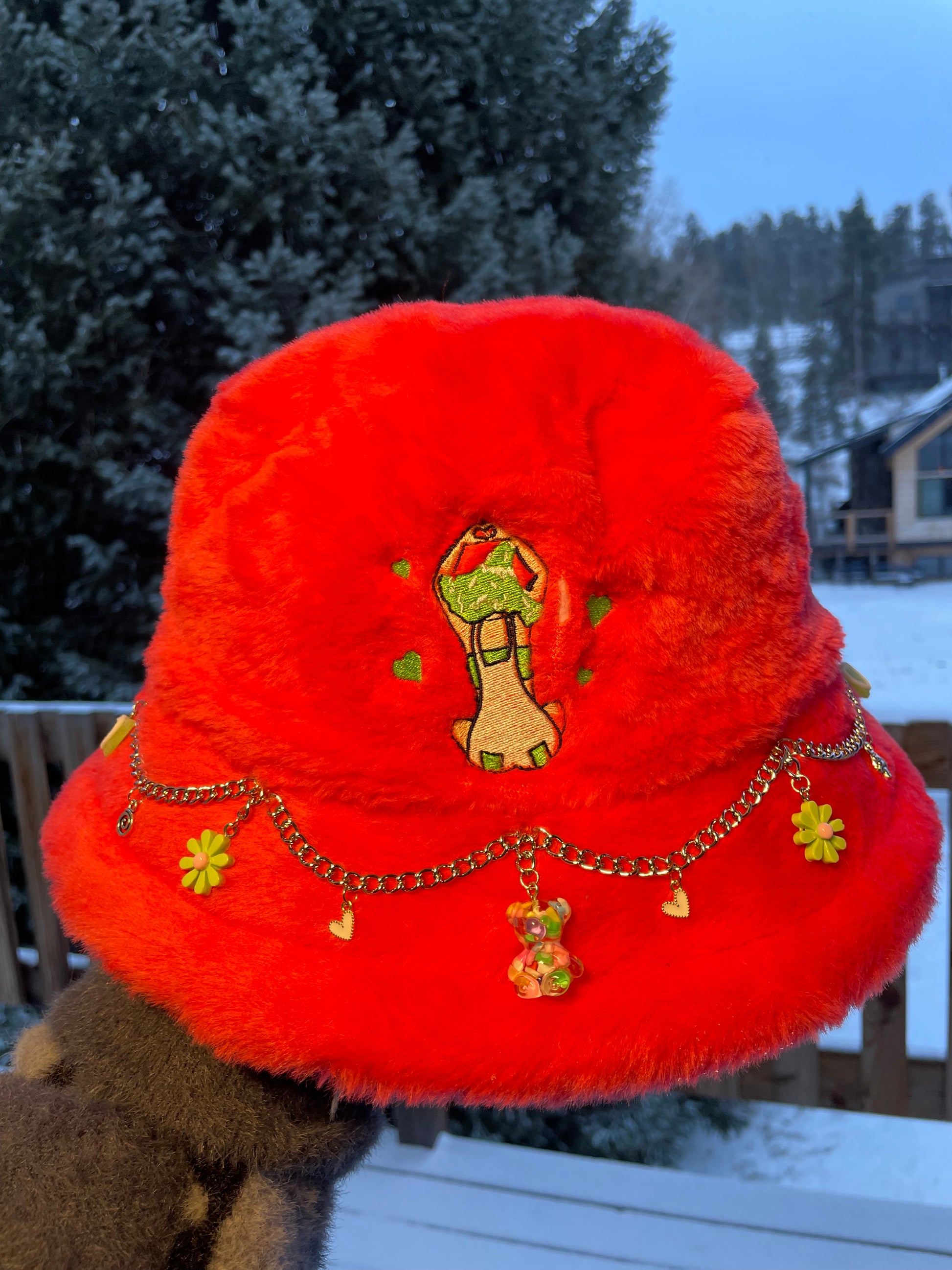 Our Pink Heart Bucket Hat is adorned with hand-sewn chains and thoughtfully curated charms, each hat has a distinct personality. At its core is the embroidered centerpiece: a charming mushroom girl expressing boundless love in every stitch. Embrace whimsy and elegance with every wear as you indulge in this delightful accessory.