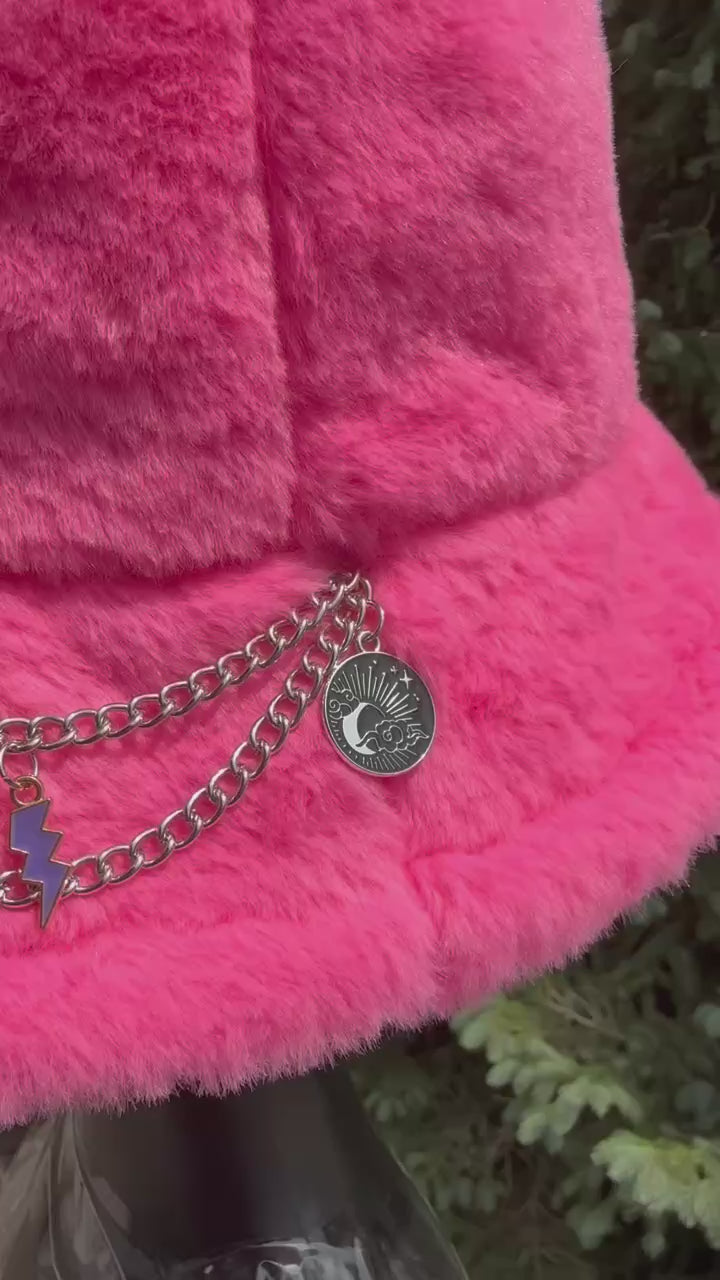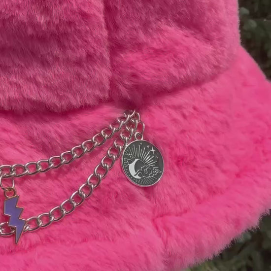 Our Pink Heart Bucket Hat is adorned with hand-sewn chains and thoughtfully curated charms, each hat has a distinct personality. At its core is the embroidered centerpiece: a charming mushroom girl expressing boundless love in every stitch. Embrace whimsy and elegance with every wear as you indulge in this delightful accessory.