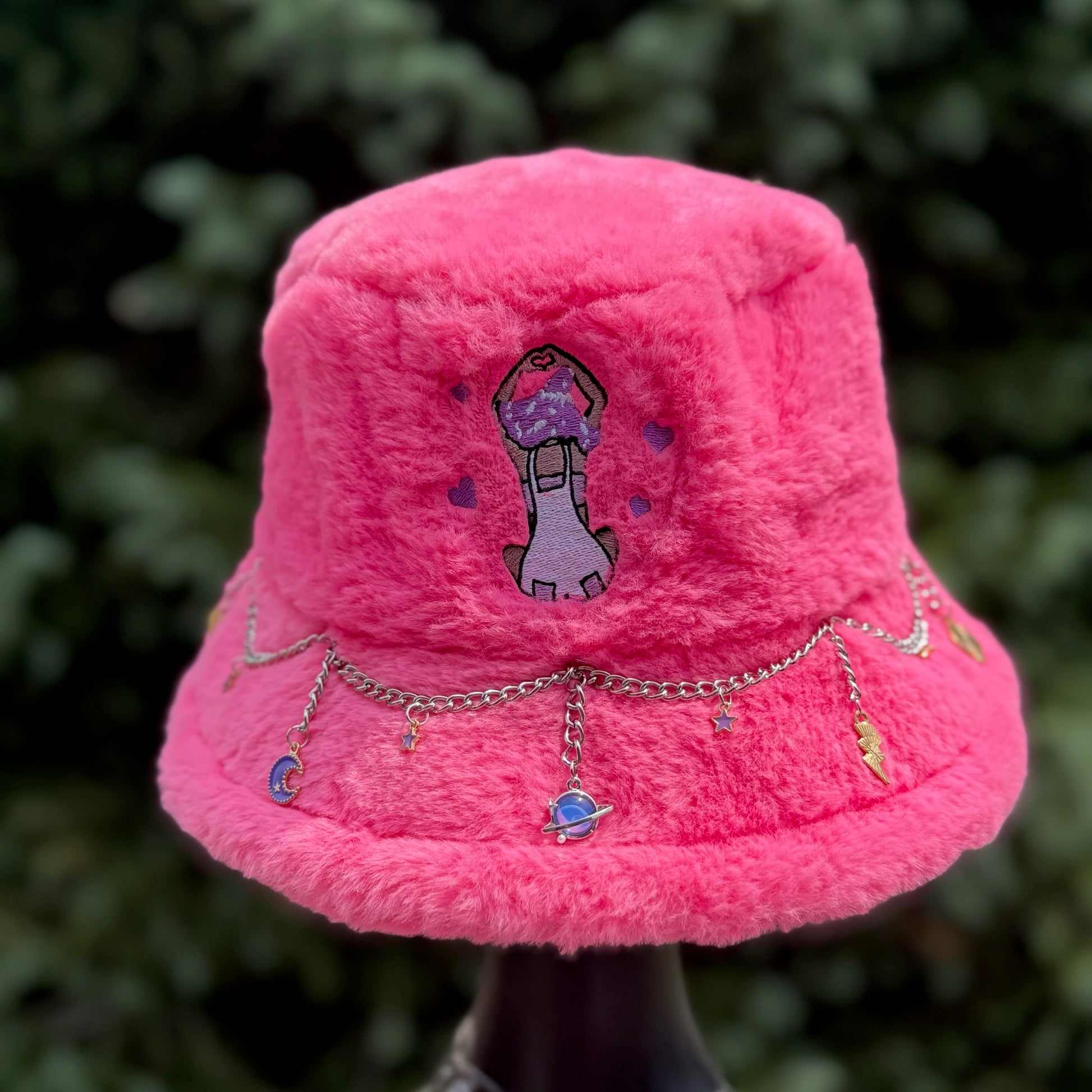 Our Pink Heart Bucket Hat is adorned with hand-sewn chains and thoughtfully curated charms, each hat has a distinct personality. At its core is the embroidered centerpiece: a charming mushroom girl expressing boundless love in every stitch. Embrace whimsy and elegance with every wear as you indulge in this delightful accessory.