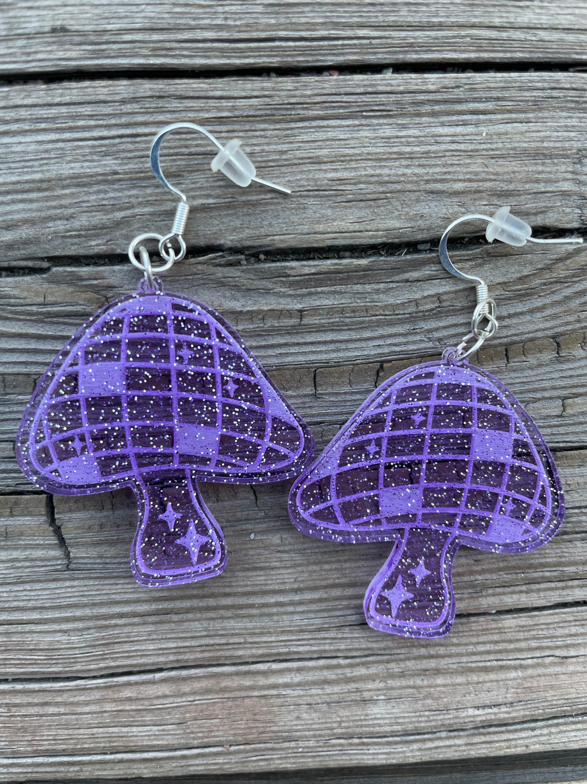 Groove with purple glitter and disco sparkle in these mushroom-shaped earrings, adding psychedelic flair and dazzling fun to any outfit.