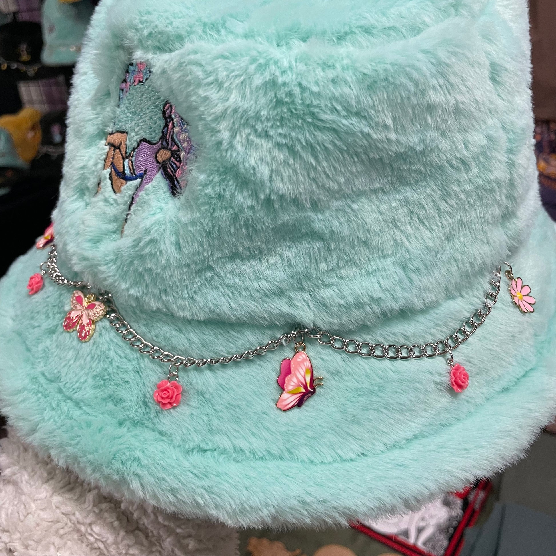 Indulge in whimsical elegance with our charming Teal Lyra Bucket hats! Vibrant teal hues and an embroidered mushroom girl hanging from a floral-adorned lyra infuse each hat with playful charm. Enhanced with a three piece butterfly mushroom pin set. Every piece radiates its own unique personality.