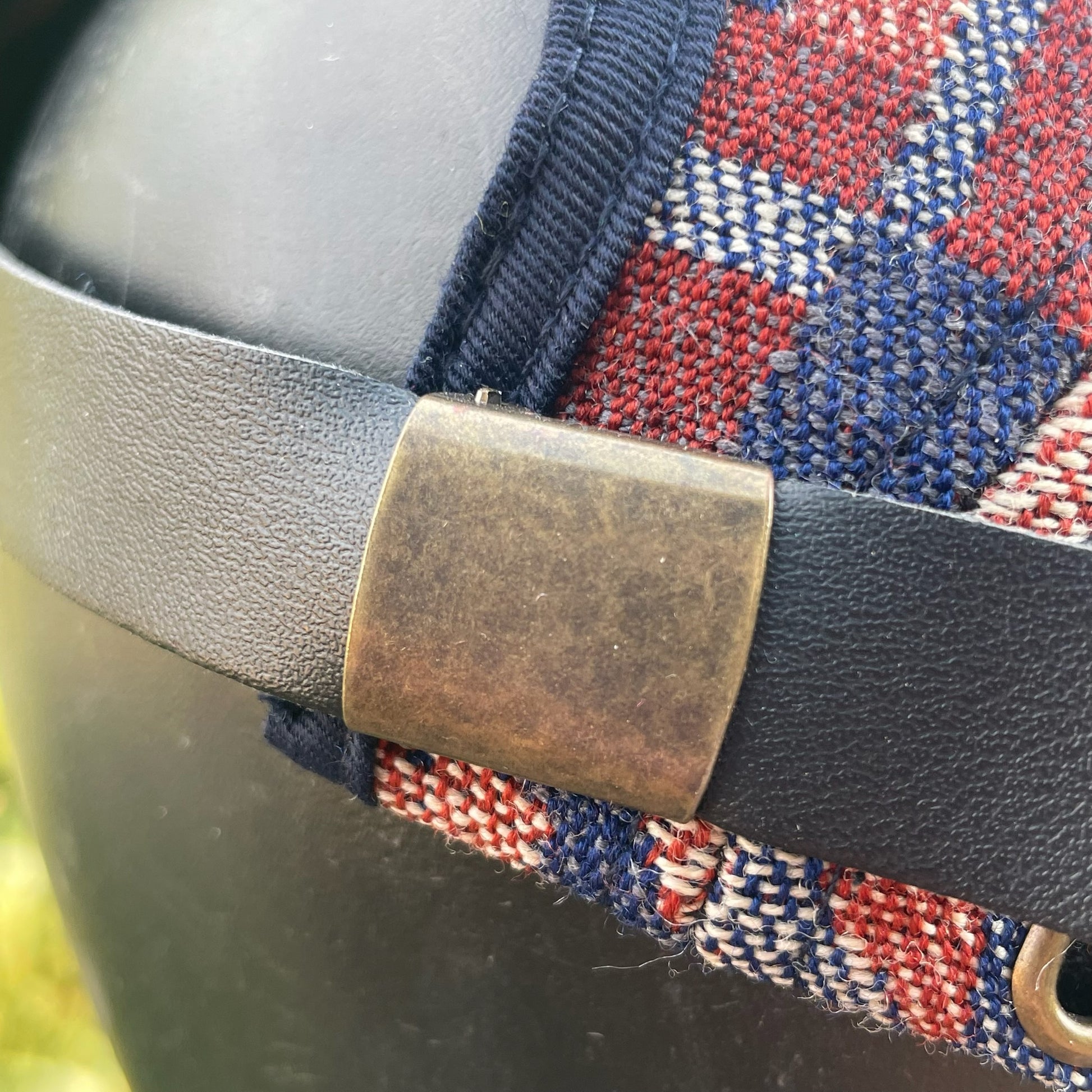 Metallic buckle close with a side opening to tuck away faux leather strap.