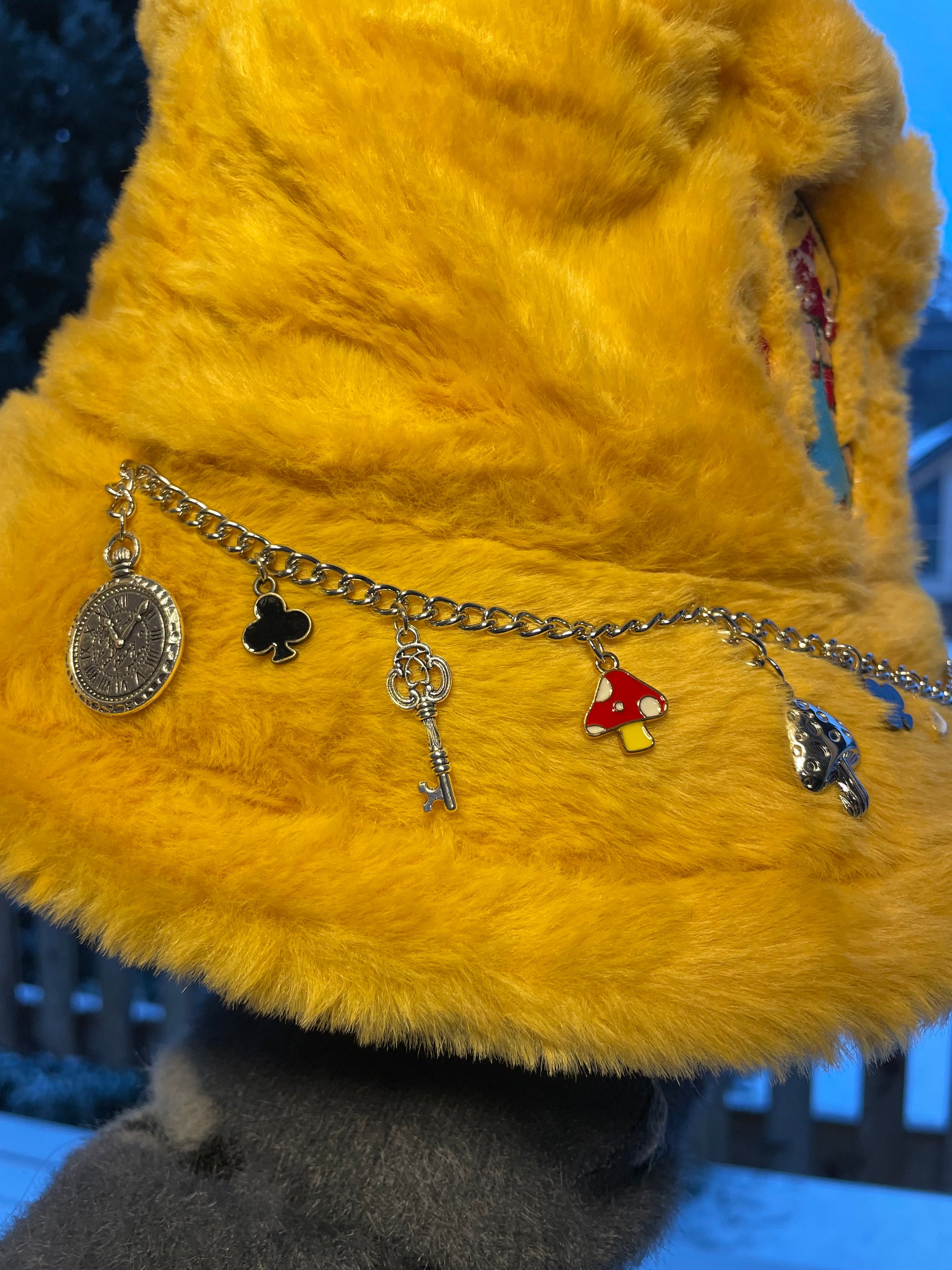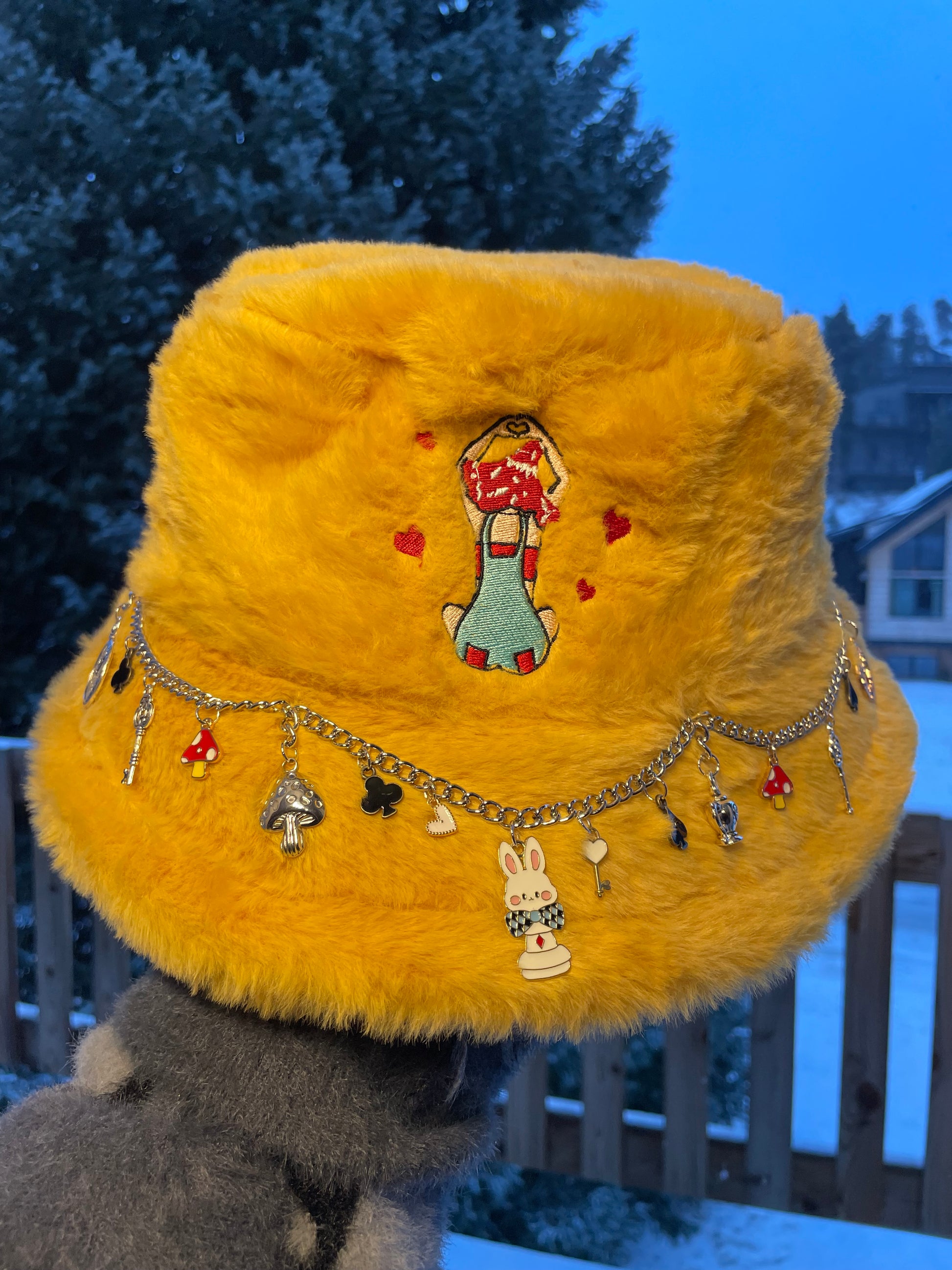 Discover our Yellow bucket hats, blending style and whimsy. Adorned with hand-sewn chains and unique charms, each hat features an embroidered mushroom girl, adding playful elegance to your look.