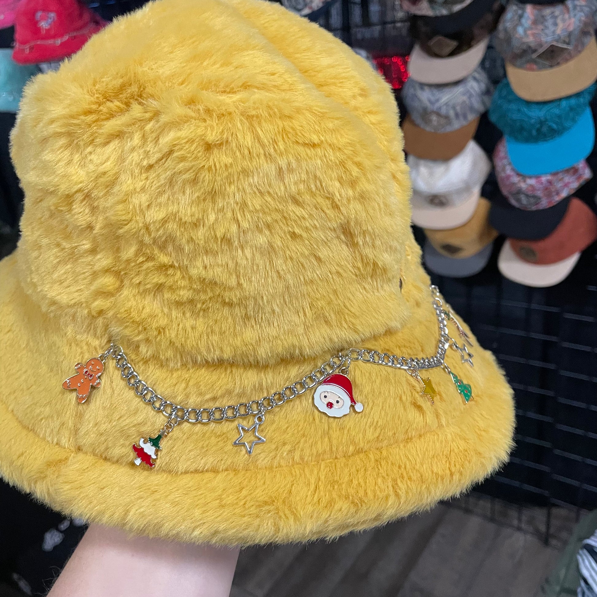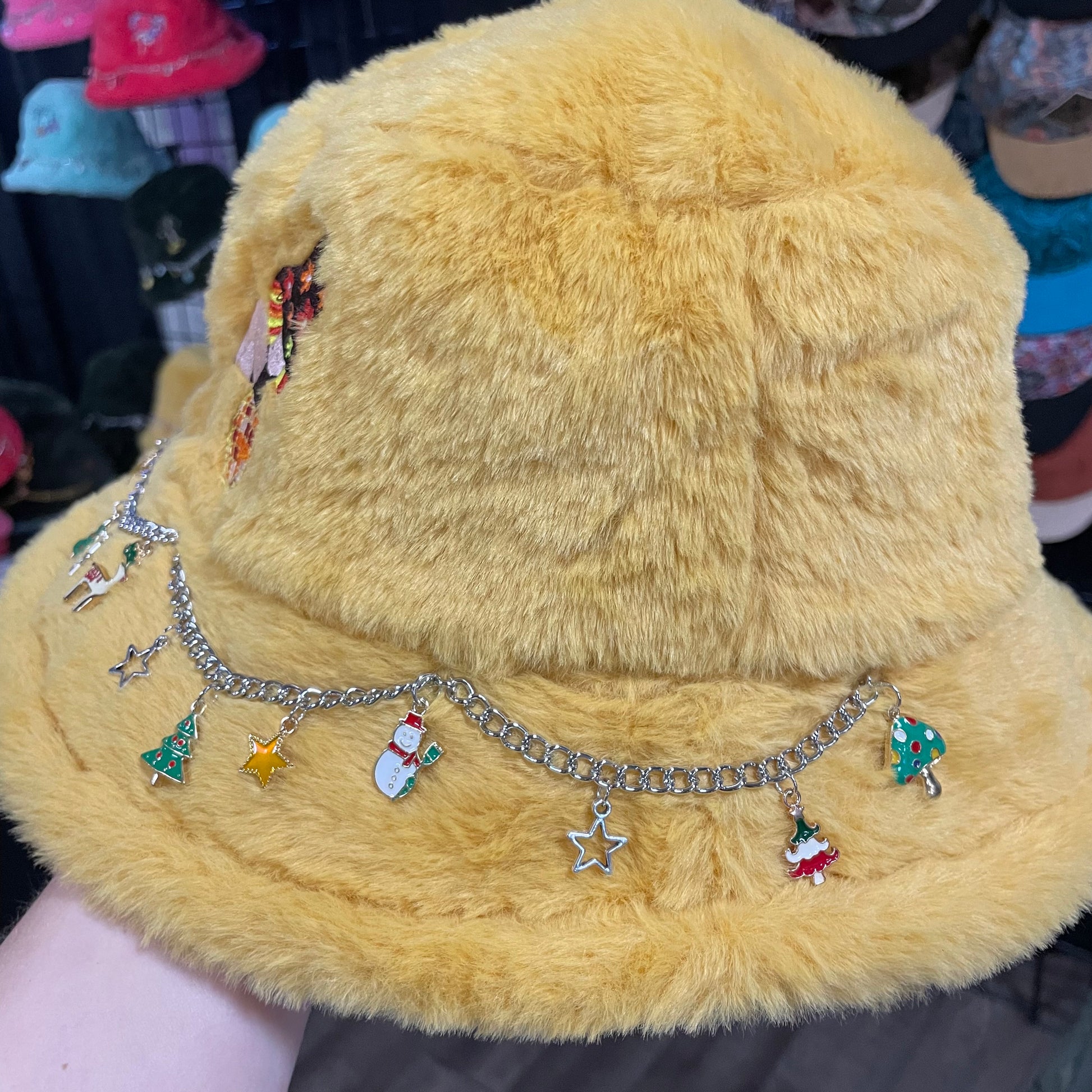 Discover our Yellow bucket hats, blending style and whimsy. Adorned with hand-sewn chains and unique charms, each hat features an embroidered mushroom girl, adding playful elegance to your look.